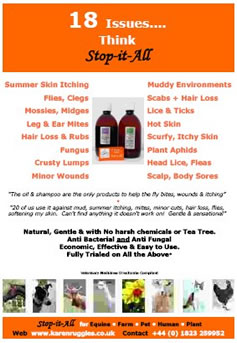 In the human scientific world there is now much evidence indicating that completely covering up from natural sunlight can be very detrimental for humans with skin issues....especially for children. Vitamin D is naturally present in very few foods but when ultraviolet rays from natural sunlight strike the skin, it triggers vitamin D synthesis both in humans and animals. A vitamin D deficiency can then lead to serious consequences including reducing calcium absorption in the gut......so bone strength can become a concern, as well as impacting on the immune system. There is a very interesting research paper available free at www.bmj.com/cgi/content/full/332/7541/584 (2006) of a Trial conducted here in the UK. The sections most of interest to me were "UV Phototherapy; UVB versus UVA" and "Do Probiotics Help". From the numerous research papers and Trials I've viewed, I feel that keeping our animals away from all natural sunlight WILL impact on their overall health. We always need to be realistic so I would never say don't use the rug. But with Stop-it-All , some owners find they can leave the rug in the tackroom, whilst others are able to give their animals small windows of time (fully sprayed up first of course!) where they're naked and utilising the natural light for the animal's 'whole health'. Being naked also allows them to roll without being constrained, to remain cooler than when covered, and when with others, to play their important role in mutual grooming. Many clients tell me there is an undeniable improvement in the animal's 'happiness/joy' when they are out without rugs...even if they're still getting a few bites! |